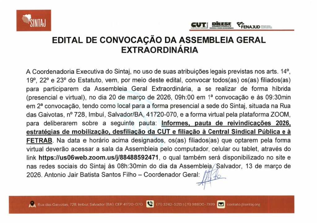 Na quinta-feira, dia 19/03, às 09h, será realizada uma reunião destinada exclusivamente aos delegados e delegadas sindicais. Na sexta-feira, dia 20/03, às 09h, acontece a Assembleia Geral Extraordinária aberta a todos os filiados e filiadas quando daremos informes, abordaremos a pauta de reivindicações 2026, estratégias de mobilização, desfiliação da CUT e filiações à Central Sindical Pública e FETRAB.
