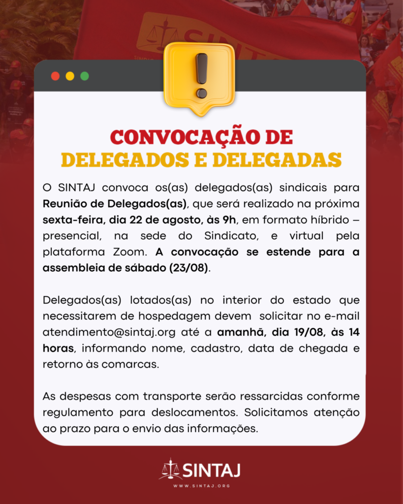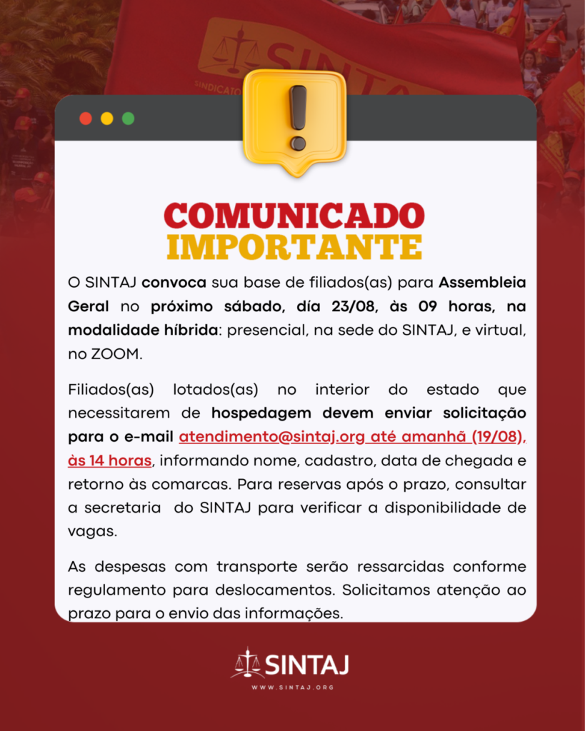 O mesmo prazo vale para os(as) filiados(as) do interior que desejarem hospedagem para participar presencialmente da assembleia do próximo sábado, dia 23/08, às 9h, em primeira chamada. O edital com a pauta da reunião será divulgado em breve.