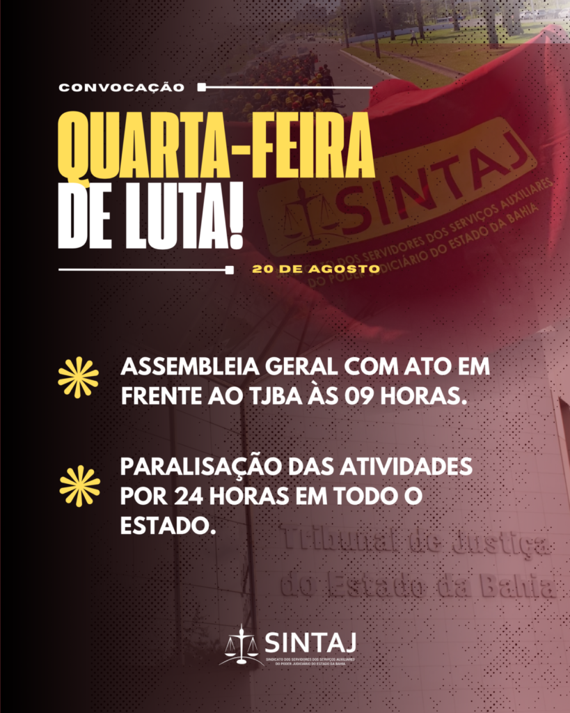 O SINTAJ convoca a categoria para uma semana de importantes atividades. Na quarta-feira, dia 20, será realizada a Assembleia Geral Extraordinária presencial, com ato em frente ao Tribunal de Justiça da Bahia (TJBA), às 9h. A data também será marcada por uma paralisação de 24 horas em todo o estado.